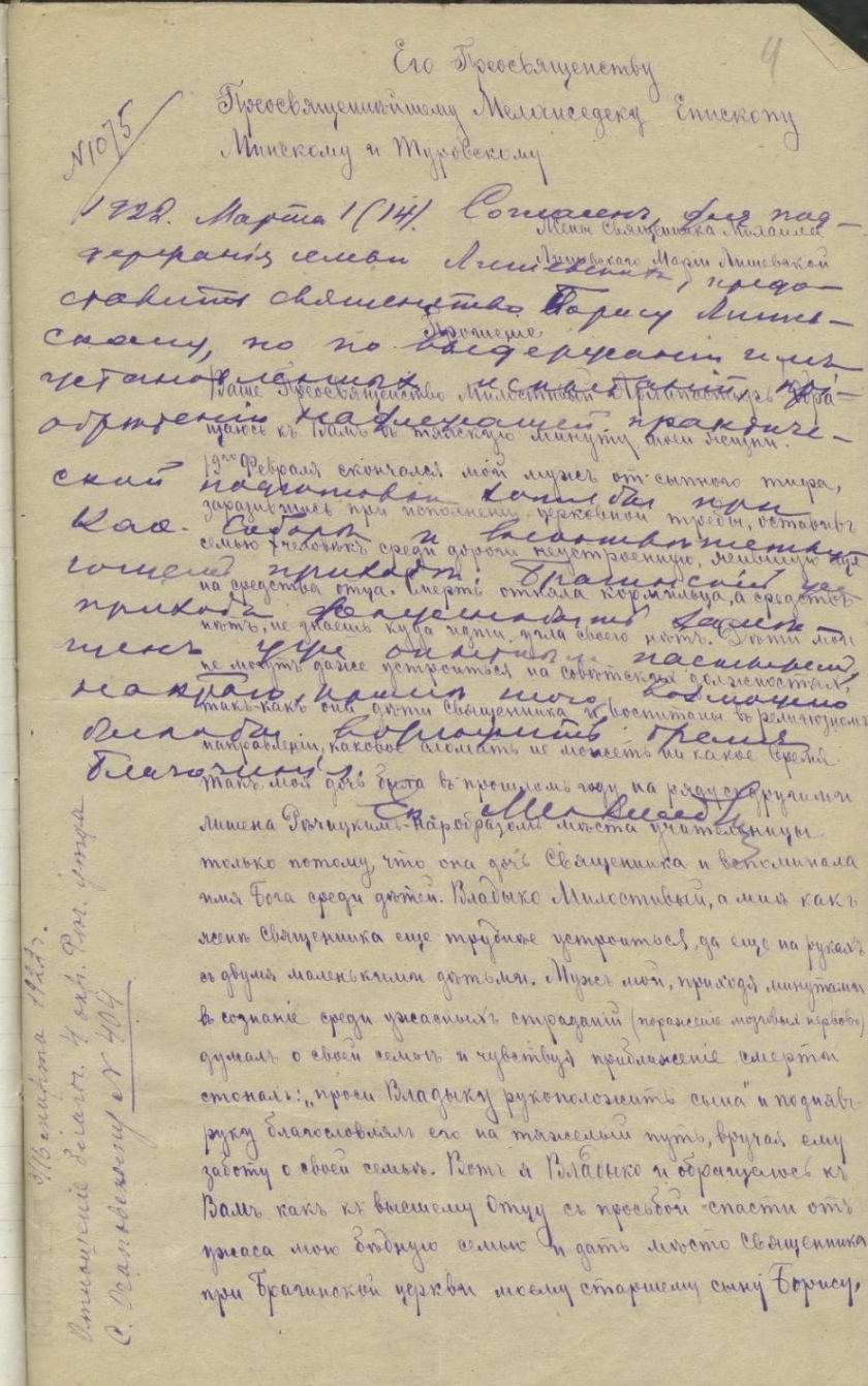 В далёком 1922 году у нас, на Гомельщине, вдова почтенного священника Михаила Лишевского пишет письмо выдающемуся архипастырю того времени епископу Минскому и Туровскому Мелхисидеку (Паевскому). В нём она, матушка Мария, просит Его Преосвященство рукоположить её старшего сына Бориса Лишевского в сан священника, назначив настоятелем Рождества-Богородицкой церкви в Брагин на место его покойного отца. А в качестве аргументов, которые, по мнению вдовы, просто обязывают архипастыря принять единственно правильное решение в отношении её сына, приводит следующее.